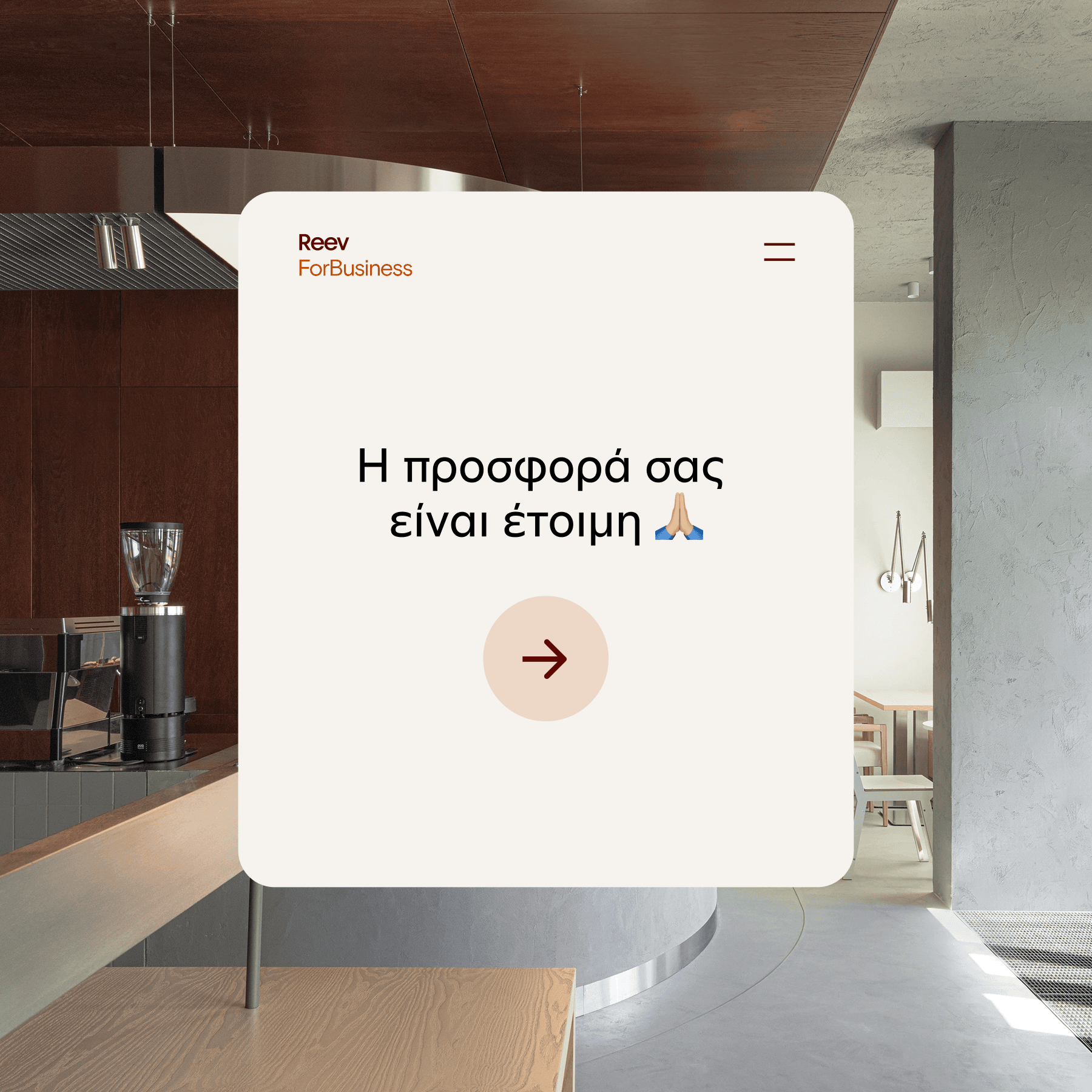 "Στη Reev πιστεύουμε ότι ο χώρος μιας επιχείρησης δεν είναι απλώς ένα κτίριο — είναι μέρος της εμπειρίας που προσφέρει στους πελάτες της. Στόχος μας είναι κάθε έργο να υλοποιείται με σωστό σχεδιασμό, προσεκτική επιλογή υλικών και υψηλή ποιότητα κατασκευής, ώστε το τελικό αποτέλεσμα να υποστηρίζει πραγματικά την ανάπτυξη της επιχείρησής σας."